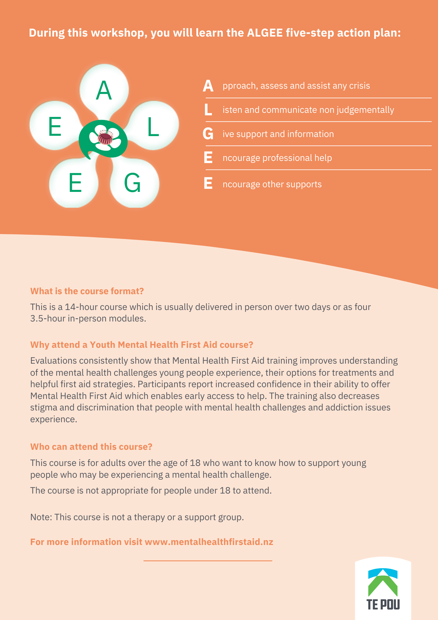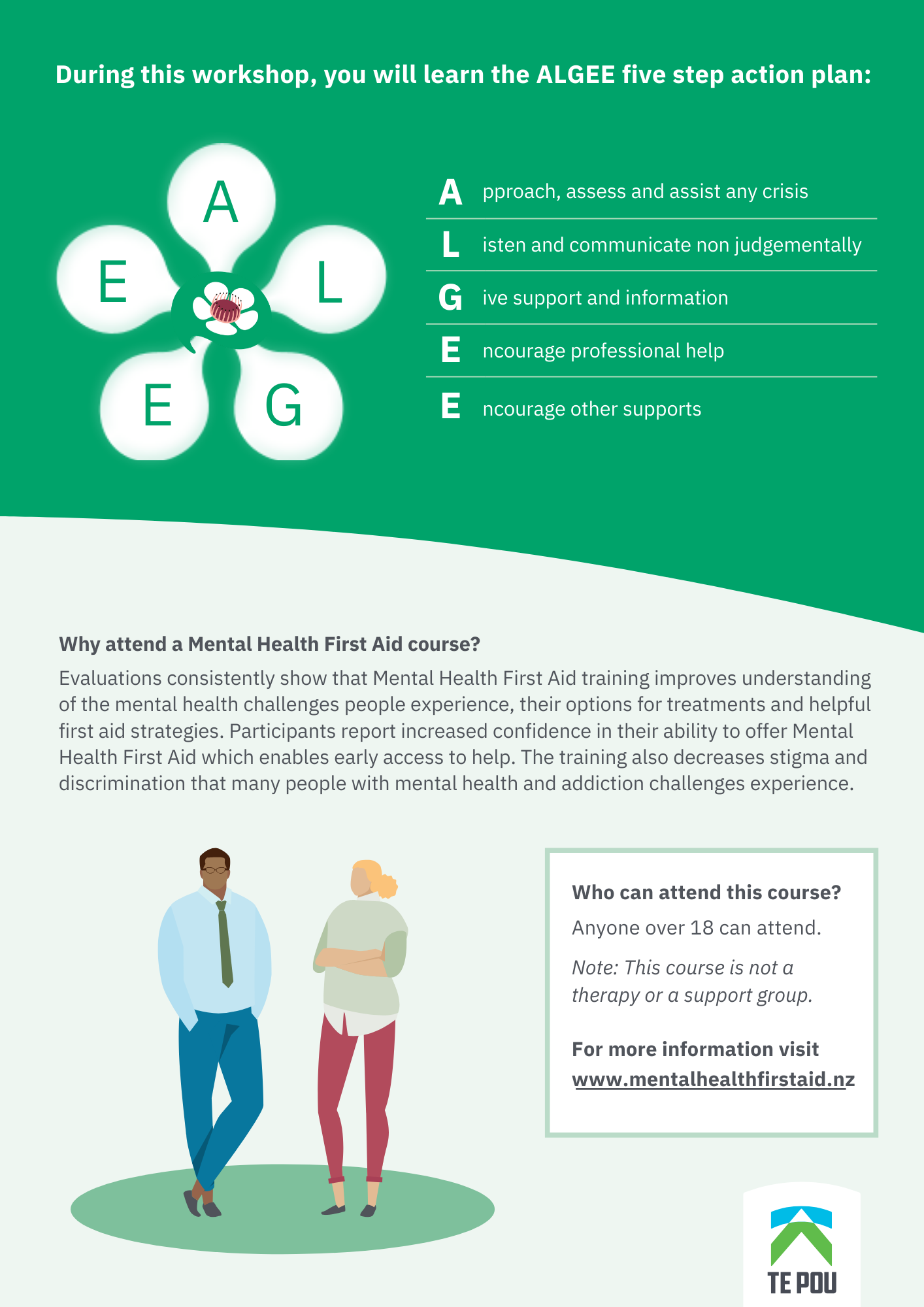 A Mental Health First Aid course will teach you how to provide initial support to adults who may be experiencing mental health challenges or mental health crisis, until the crisis resolves, or specialist help is accessed, using a practical evidence-based Action Plan.