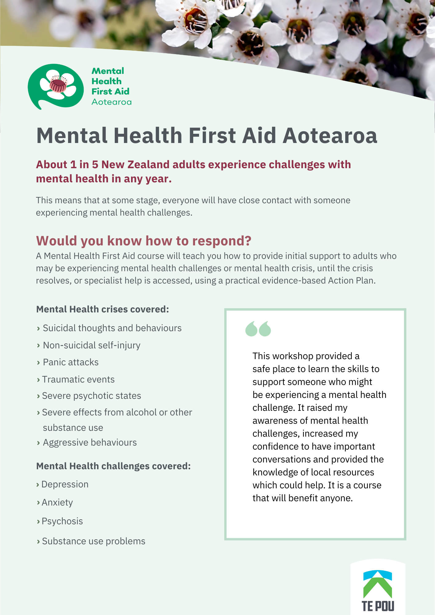 About 1 in 5 New Zealand adults experiences challenges with mental health in any year. This means that at some stage, everyone will have close contact with someone experiencing mental health challenges.